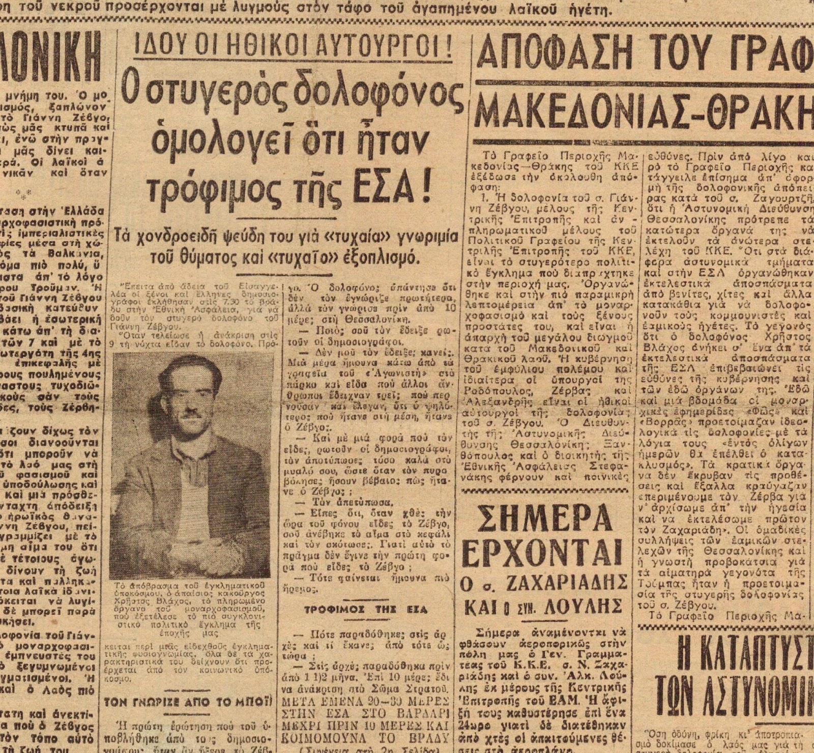 Ταυτόχρονα, το υπουργείο Τύπου στην Αθήνα, διοχέτευε σε όλες τις εφημερίδες της εποχής ένα κείμενο, σύμφωνα με το οποίο το έγκλημα δεν ήταν πολιτικό, αλλά έγινε για λόγους… τιμής, καθώς ο Ζεύγος και άλλα γνωστά στελέχη του ΚΚΕ είχαν…. εκπορνεύσει τη σύζυγο του δράστη!